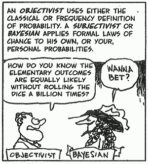 Het fundamentele verschil tussen Bayesiaanse en frequentistische statistiek is inderdaad dat in de Bayesiaanse statistiek een subjectieve waarschijnlijkheid kan worden toegekend aan een bepaalde parameter (bv. een onbekend conversiepercentage). Volgens de frequentistische filosofie is dat raar: het conversiepercentage is weliswaar onbekend, maar vast. Het is bv. 6,5%, al weten we dat nog niet. Het is onzinnig (volgens frequentisten) om te zeggen dat er “50% kans is dat het tussen 6 en 7%” is. Het is gewoon een bepaald onbekend percentage en daarmee basta.