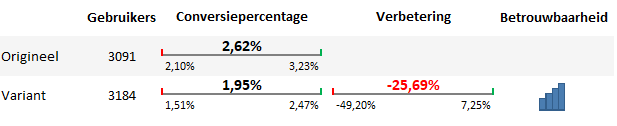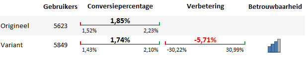 De nieuwe variant presteert slechter dan het origineel. De betrouwbaarheid is groot; dat betekent vrijwel zeker dat het verschil tussen de varianten klopt. In dit geval zal het doorvoeren van de aanpassingen dan ook leiden tot een conversiedaling en daarom niet aan te raden.