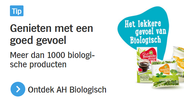 Dan komt er weer een ‘vaag werkwoord’: “Ontdek AH Biologisch.” Terug de hypnose in! Deze drie zinnen vormen dus een nette afwisseling tussen vaag en specifiek. Sluit bij voorkeur af met specifiek zodat de lezer weet wat hij moet doen. Dit is de call to action en na al die vaagheid die eraan vooraf ging kun je stellen dat de call to action een concrete hypnotische suggestie is. Albert Heijn heeft in het voorbeeld gekozen voor een vage call to action, ook een interessante keuze. Ze hadden ook kunnen kiezen voor iets specifieker zoals “Shop nu biologisch”.