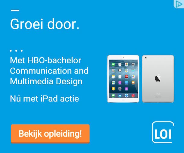 Daarna komt de concrete informatie waar het echt om gaat: de HBO-opleiding Communication and Multimedia Design. De volgende zin, “Nú met iPad actie” is weer vaag doordat het trance woord ‘nú’ erin zit en doordat je zelf mag invullen wat de iPad-actie inhoudt (waarschijnlijk dat je er eentje gratis krijgt als je je inschrijft).