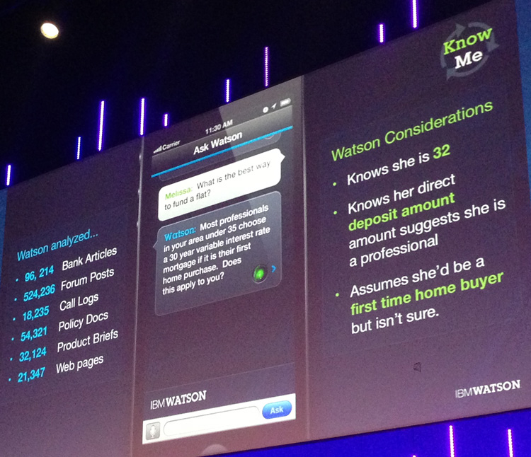 Saxena schetst een scenario als voorbeeld van de toepassing van Watson-technologie in marketing. Een jonge vrouw ziet op haar mobieltje een Facebook-banner voor een hypotheek. Niet toevallig, want ze is al wat langer op zoek naar een nieuw huis. Ze klikt op de banner en een SIRI-achtige stem vraagt haar wat ze exact wil weten. Vervolgens helpt Watson haar verder met vragen als “Waar moet ik beginnen met het hele proces van het kopen van een huis?” en “Wat is de beste manier om een flat te vinden?”. Daarbij wordt geput uit een grote hoeveelheid bronnen, maar ook uit de kennis die beschikbaar is van de vrouw zelf (32 jaar, wonend in stad X) en enkele aannamen die Watson over haar doet (ze is een 'professional', het is de eerste keer dat ze een huis koopt).