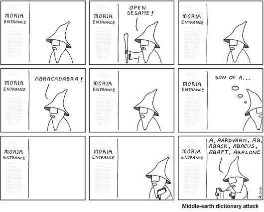 Een veel gebruikte techniek om een beveiligingssysteem te doorbreken, is de brute force-aanval. Ze proberen wachtwoorden die veelgebruikt worden en woorden die in het woordenboek staan. Mensen vergeten altijd wachtwoorden. Daarom gebruiken we altijd iets waar we ons aan kunnen herinneren. Van vroeger. Dat maakt ze zo zwak.