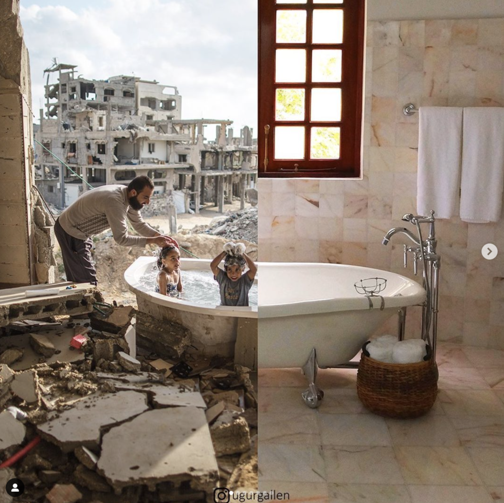 Beelden zeggen meer dan duizend woorden. De Turkse kunstenaar Uğur Gallenkuş, heeft dat goed begrepen door digitale collages te maken waarbij het contrast tussen verschillende delen van de wereld direct zichtbaar wordt. Door de westerse wereld te koppelen aan een deel uit conflictgebieden, laat hij zien hoe het leven voor individuen zo enorm verschillend kan zijn, ondanks het feit dat we allemaal in de 21e eeuw op dezelfde planeet wonen. Kijk maar eens naar zijn Instagram account. En de plaatjes zeggen genoeg.