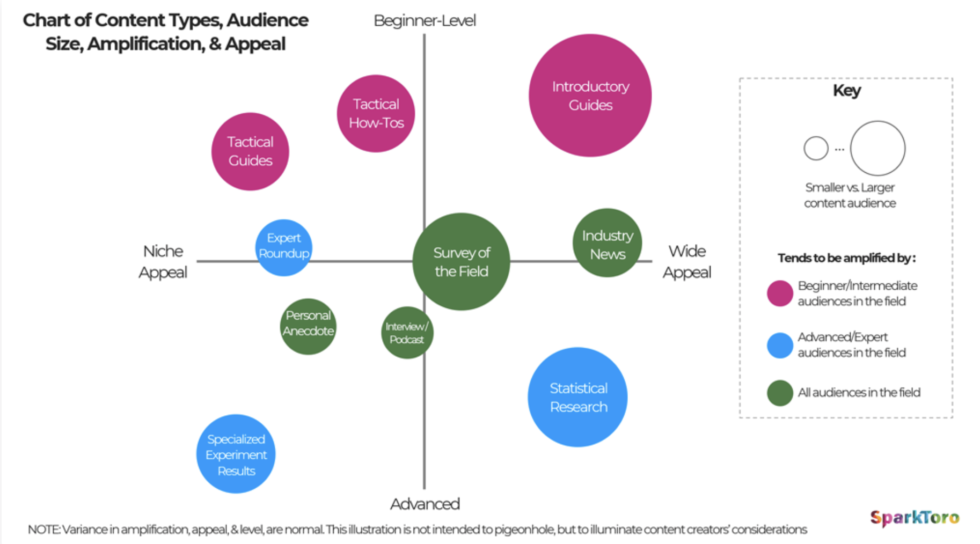 Algemene (beginners) content gericht op doelgroepen die doorgaans veel consumeren (dat wil zeggen: ze lezen/kijken veel) hebben vaak als nadeel dat het daar ontbreekt aan de zogenaamde amplification. Met andere woorden; ze zijn niet bijzonder invloedrijk in hun vakgebied. Meer tactische content van een hoger niveau is meestal aantrekkelijk voor een kleiner publiek (vooral als het echt uniek en waardevol is) en deze groepen hebben het voordeel dat zij in staat te zorgen voor een substantieel versterkingspotentieel. Zij zijn de opinieleiders, schrijvers, uitgevers, redacteuren, sprekers, podcasters, enzovoort van hun werelden. De versterkers (experts) kunnen meestal helpen om de algemene doelgroepen te bereiken. Andersom werkt het vaak niet. Wil je weten op welke wijze je deze strategie kan toepassen? Lees dan deze post van Sparktoro.
