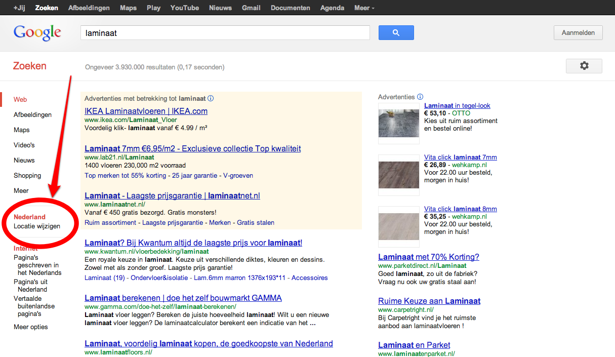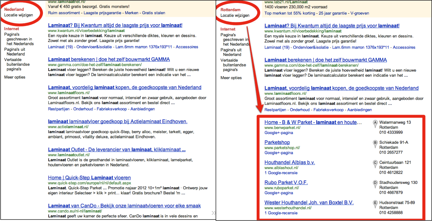 Een update die veel impact heeft, maar die je snel over het hoofd ziet, is bekend als de ‘Google Venice update’. Google stelt namelijk automatisch de locatie in waarvandaan je zoekt en past je zoekresultaten daar sterk op aan.