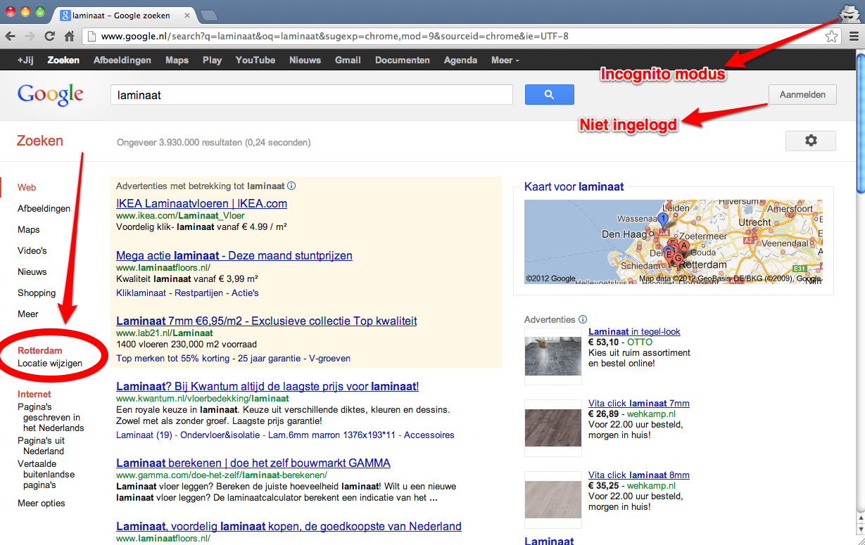 Merk op dat ik in Google Chrome niet ingelogd ben met mijn Google account en de zogeheten ‘incognito modus’ gebruik.