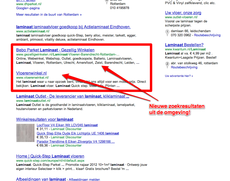 Als je in bovenstaand voorbeeld verder omlaag scrolt, dan zie je pas echt het ‘onzichtbare’ effect van de Google Venice update: