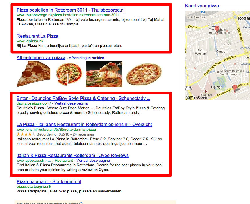 In bovenstaand voorbeeld is dat bijvoorbeeld Thuisbezorgd.nl. Deze website scoort normaal al in de top 10 op ‘pizza’, maar na de Venice update kiest Google hier een pagina gerelateerd aan de automatisch ingestelde locatie.