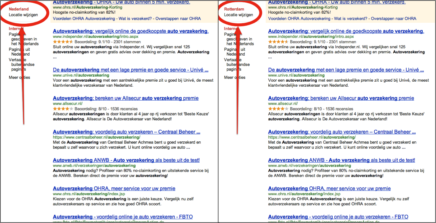 Als zoekmachinegebruiker merk je dit nauwelijks, maar de zoekresultaten worden hierdoor duidelijk beïnvloed. Dit laat zich duidelijk uitleggen aan de hand van een paar voorbeelden hieronder.
