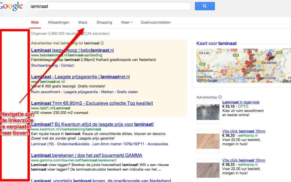 Google rolt deze maand (november 2012) een nieuwe layout uit van de zoekresultaten, waarbij de navigatie aan de linkerzijde is verplaatst naar boven. De zoekresultaten uit afbeelding 2 zien er nu dus als volgt uit: