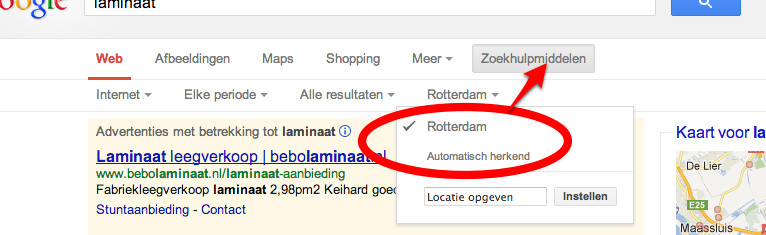Echter, sinds begin 2012 is Google actiever de locatie waarvandaan je zoekt gaan gebruiken. Zonder dat je het eigenlijk in de gaten hebt, stelt Google automatisch de plaats in waarvandaan je zoekt.