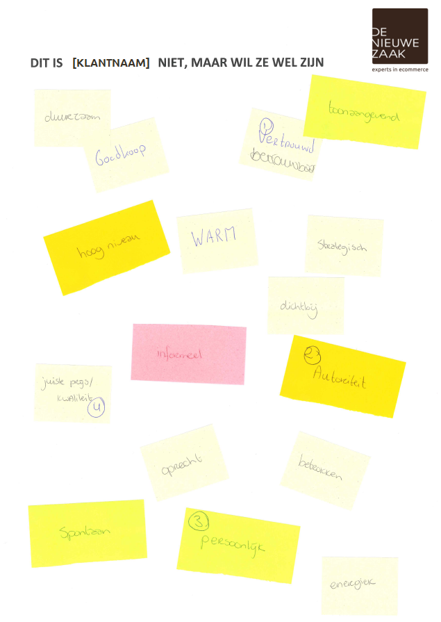 In stap vier ga je jezelf verdiepen in je klant en je jezelf. Bedenk kernwaarden, bijvoeglijke naamwoorden en andere belangrijke kenmerken van jouw organisatie en begin met denken vanuit je klant: “Vindt de klant dat ik dit wel of niet ben?”. Daarna verplaats je je naar jezelf: “Wil ik dit wel of niet zijn?”. Op deze manier vul je vier verschillende pagina’s in: