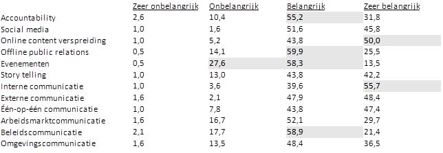 Ook de deelgebieden offline public relations, beleidscommunicatie, evenementen en accountability tonen hoge uitschieters. Het lijkt er dus op dat de meest belangrijk geachte toekomstige taken in het communicatievak vooral offline en intern zijn. Kijk je echter naar de som van Belangrijk en Zeer belangrijk, dan blijkt dat Social Media de betwiste nummer 1 is, op de voet gevolgd door Externe Communicatie en Interne Communicatie. De meningen verschillen hier en daar, maar één ding is zeker, de meeste communicatieprofessionals vinden álle taken belangrijk (zo zien we het graag!).