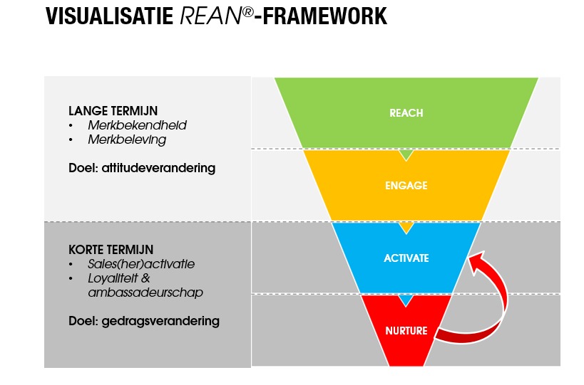 Stel, je rekent je SEA-activiteiten af op een overall CPA-doelstelling van €25 voor een transactie en je hebt gekozen voor een attributiemodel op basis van de laatste interactie. Dan zal je, naar gelang de gebruiker zich in een andere fase van het aankoopproces bevindt, de ene campagne een andere CPA-doelstelling mee moeten geven dan de andere campagne. Omdat een generieke campagne een andere bijdrage levert aan de totstandkoming van een conversie dan bijvoorbeeld je merknaam. Om dit proces te visualiseren maken wij gebruik van het REAN-model. Hier maken we onderscheid in de verschillende fasen van het aankoopproces:
