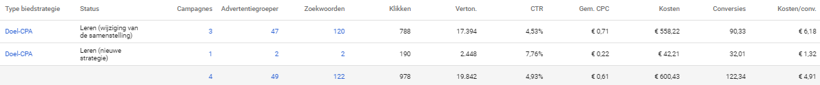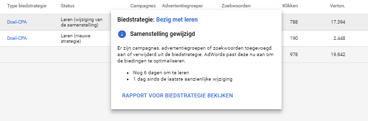 Na de implementatie van je biedstrategie is het belangrijk dat je rekening houdt met de status van de biedstrategie. Nadat je de biedstrategie hebt ingesteld zal hij, afhankelijk van het conversievolume dat de biedstrategie genereert, een bepaalde periode de melding ‘Bezig met leren’ weergeven.