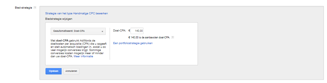 Om je hier en handje bij te helpen doet AdWords een voorstel bij het aanmaken van een biedstrategie op campagneniveau. Dit doet AdWords vooralsnog alleen in de oude interface.