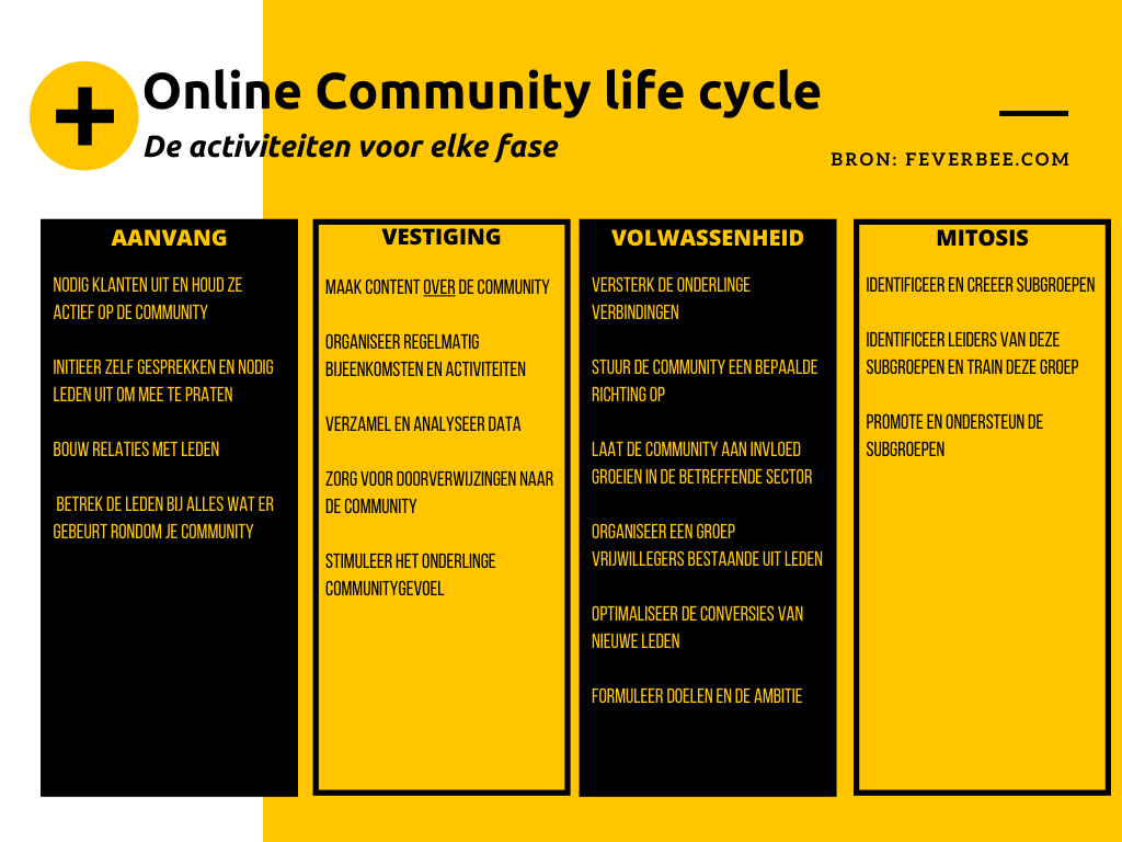 Bij deze stap is het belangrijk dat je niet ongeduldig wordt. Het is heel normaal dat jij en je organisatie de enige actievelingen zijn op het communityplatform. Volgens de Community Life Cycle (zie NL versie hierboven) is de eerste 6 maanden de inception phase. De berichten komen nu nog voornamelijk vanuit de organisatie en het aantal volgers groeit gestaag. Observeer wat er gebeurt in deze fase: wie zijn er online? Betrek hen bij de verdere uitbouw van je community. Onthoud dat een community organisch groeit. Je kunt het niet uit de grond trekken, geef het water, voldoende licht en aandacht.