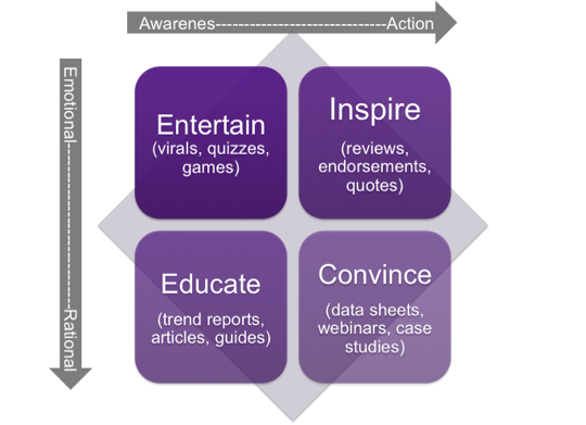 Een model dat helpt met het inzichtelijk maken van de contentbehoefte is hieronder weergegeven. Er wordt onderscheid gemaakt tussen de fase binnen de customer journey en de emotionele en rationele aspecten van de content.