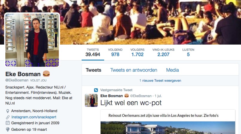 We onderzoeken onze resultaten verder en belanden op het profiel van onze nummer één, Eke Bosman. Eke blijkt redacteur voor NU.nl en tevens zelfbenoemd “snackspert”. Zijn Instagram-profiel blijkt ook die naam te zijn. We kunnen er vanuit gaan dat als iemand zich profileert als snackspert, zijn volgers graag op de hoogte blijven van snacknieuws – ook omdat hij al meerdere malen over frikandellen heeft bericht in de afgelopen tijd.