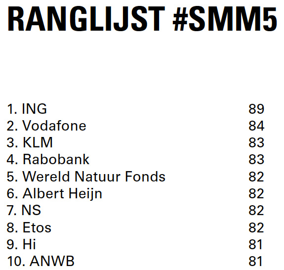 De ranglijst is dit jaar dan ook meer dan ooit een reflectie van wat bedrijven met ons hebben gedeeld. Uiteindelijk hebben ca. 60 van de 100 bedrijven dat ook gedaan. Vervolgens is de lijst nog aangevuld met bedrijven die niet in de Nielsen top 100 staan, maar die volgens de deelnemers aan het onderzoek wel een voorbeeld zijn in de wijze waarop zij social media gebruiken. Daardoor prijken dit jaar voor het eerst partijen als KLM, WNF, Alpe d'Huzes en Deloitte op de lijst.