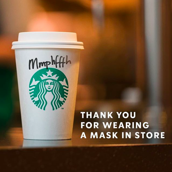 De koffie mag op naam van Mmphfffh! Wat zeg je? Starbucks speelde goed in op het advies om mondkapjes te dragen in horecagelegenheden.