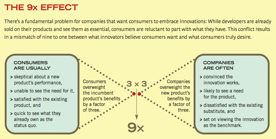 In dat artikel beschrijft de auteur John T. Gourville hoe gebruikers de waarde van een product irrationeel overwaarderen; ze zijn skeptisch over het nieuwe product en tevreden met het huidige, zien de noodzaak tot overstap niet. En tegelijkertijd is de overwaardering van het nieuwe product door het bedrijf zelf net zo irrationeel: ze zien de noodzaak uiteraard wel, zijn ontevreden over het huidige product en zien het nieuwe product als de benchmark.