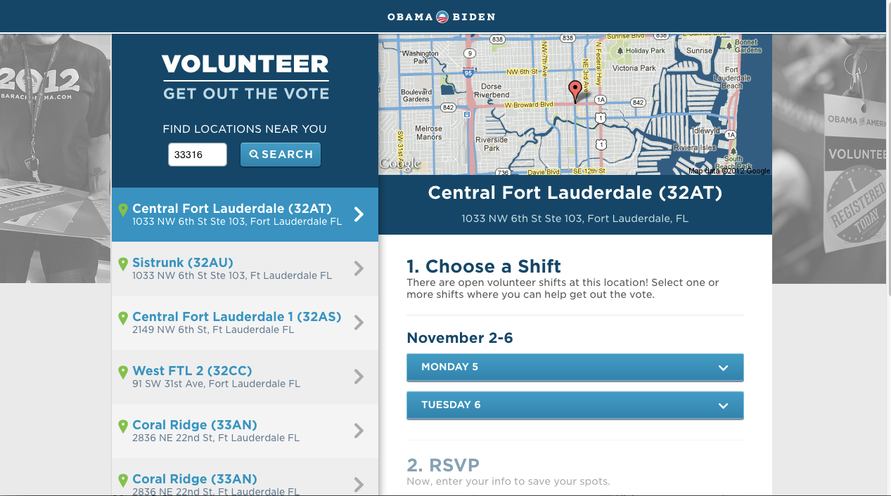 De Amerikaanse presidentscampagne van 2012 begon pas echt begin oktober. Toen vond het eerste televisiedebat plaats in Denver. En een van de leukste dingen van Amerikaanse campagnes op de grond volgen is het enthousiasme van de Amerikanen. De Obama-campagne heeft hier slim op ingespeeld door vrijwilligers zich zo decentraal mogelijk te laten organiseren. Dat is goed gelukt met de organisatie van 358.000 offline events en 1,1 miljoen RSVP's.