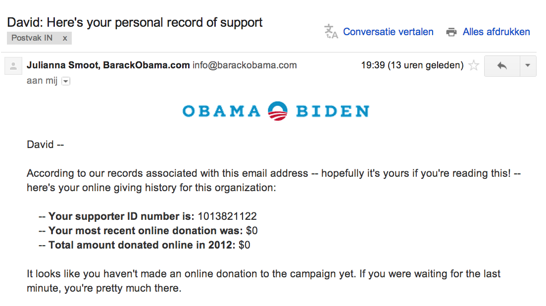 Hoe anders loopt de gesmeerde e-mailmachine van Obama. Voorzien van een duidelijke call-to-action wordt er steun gevraagd door Michelle Obama, Joe Biden en Barack zelf natuurlijk.