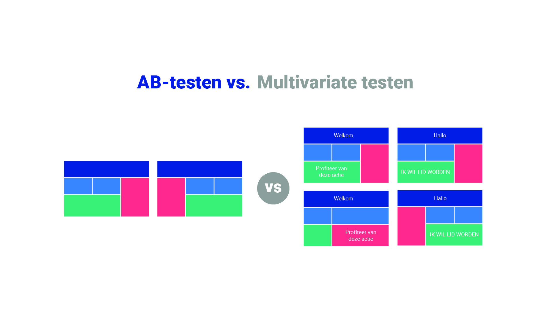 eenvoudige manier om te beginnen met testen, maar het beperkt de mogelijkheden wel tot één element per keer. Indien u verschillende elementen wil testen, kan deze testmethode erg tijdrovend zijn. Dan zal multivariate testen een efficiëntere testmethode zijn. Bij multivariate testen worden verschillende variaties van meerdere elementen met elkaar vergeleken om te bepalen welke combinatie voor de beste resultaten zorgt. Merken kunnen beide testmethodes gebruiken afhankelijk van de situatie en het uiteindelijke doel.