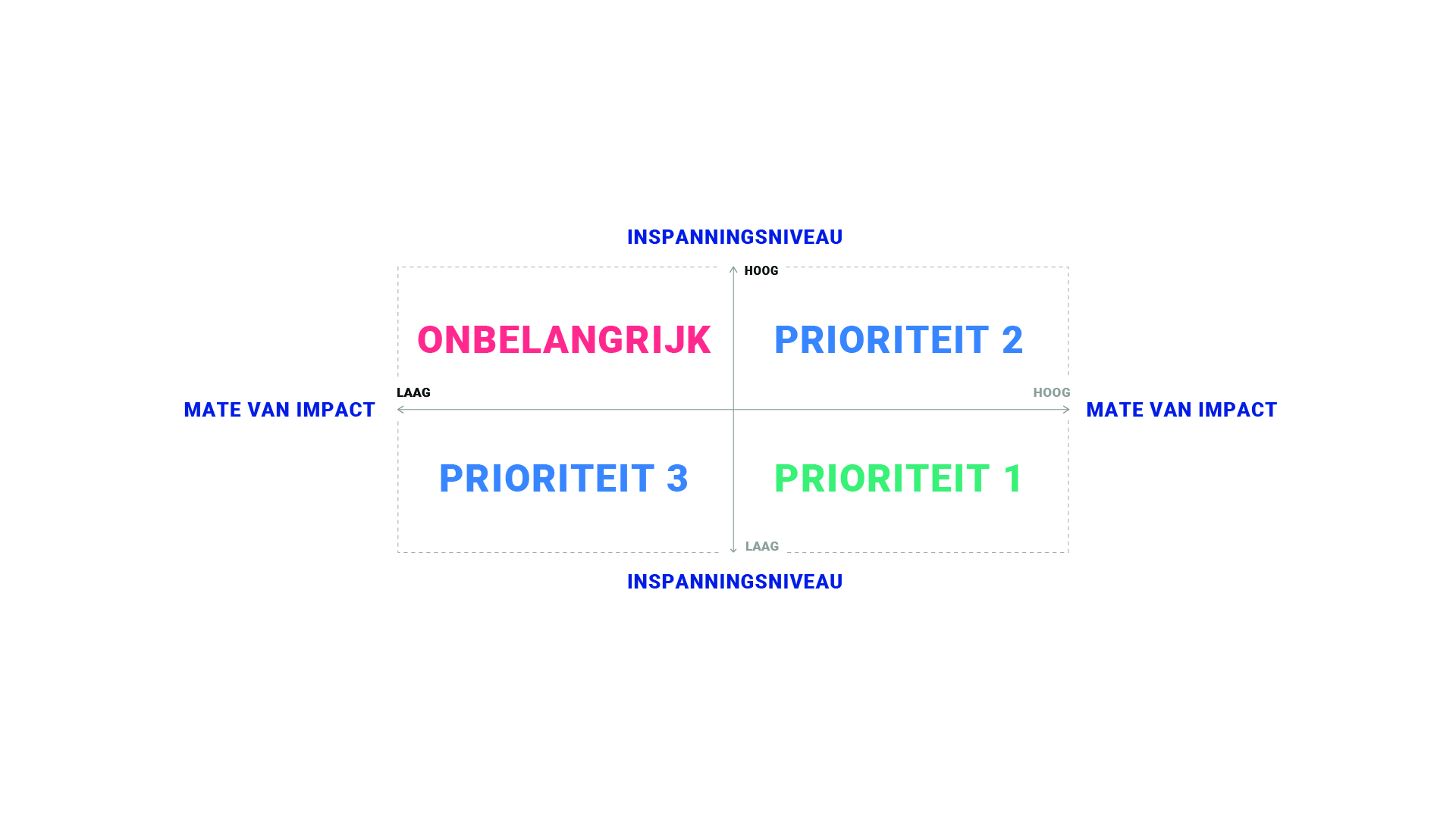 De research uit de eerste stap helpt u te identificeren waar er ruimte is voor verbetering. Nu moet u beslissen wat u als eerste aanpakt. En dat kan een uitdaging zijn. Om een volgorde te bepalen voor die lijst van verbeterpunten heeft u een gestructureerd systeem nodig. Hierbij krijgt elk item een bepaalde plaats op de rangschikking op basis van de hoeveelheid impact en de inspanning die nodig is voor het testen. Het is slim om als eerste een aspect te testen met weinig inspanning en veel impact. Gebruik het kwadrant hieronder als leidraad voor de rangschikking.