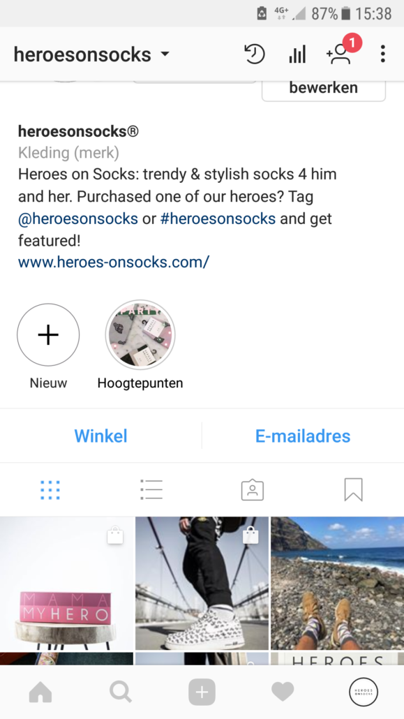 Instagram heeft een optie ingebouwd waarmee een winkel-tabblad geactiveerd wordt, wanneer je meer dan negen shopping-posts online zet. Hierop kan je een overzicht genereren van al je foto’s, waar links inzitten naar de producten die je verkoopt. Voor mijn klant Heroes on Socks heb ik dit ondertussen gerealiseerd: