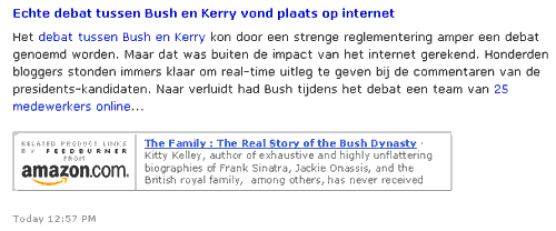 Sinds deze week biedt Feedburner de mogelijkheid aan Amazon Associates, ie deelnemers aan het affiliateprogramma, om een link naar Amazon in de feeds op te nemen. De komende dagen wil ik deze mogelijkheid eens testen dus bestel je iets nadat je op de link in mijn feeds klikt, dan wordt er op mijn Amazon-account een bedrag bijgeschreven waarvoor ik kan shoppen in de Amazon-winkel.