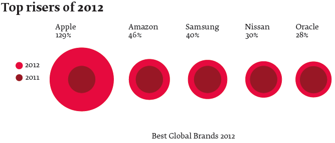 Apple (+129% groei in merkwaarde): ondanks het overlijden van Steve Jobs is de emotionele binding van de consument met het merk Apple sterker dan ooit, hetgeen nog eens werd bevestigd met de recente introductie van de iPhone 5. Ook ten overstaan van toenemende concurrentie van rivalen als Google (4) en Samsung (9) steeg de merkwaarde van Apple het afgelopen jaar met een indrukwekkende 40%. Apple blijft zich onvermoeibaar inspannen voor de bescherming van zijn merknaam en intellectuele eigendom. Die inspanningen leidden ertoe dat het bedrijf in juli een kwartaalomzet kon melden van 35 miljard dollar en een netto kwartaalwinst van 8,8 miljard.