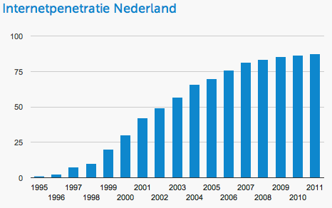JIC STIR heeft vandaag nieuwe cijfers bekend gemaakt over het gebruik van internet in Nederland in haar jaarlijkse Media Standaard Survey rapport. Uit die cijfers blijkt dat het afgelopen jaar het gebruik van internet met 18% is gegroeid. Een klein deel van deze groei wordt veroorzaakt door de toename van het aantal internetters, wat met met 1% groeide naar 87,2%. De grootste groei zit in tijd die we doorbrengen op internet. In 2010 noteerde JIC STIR nog 8,3 uur per week, maar in 2011 ligt dat op 9,8 uur, oftewel 84 minuten per dag.