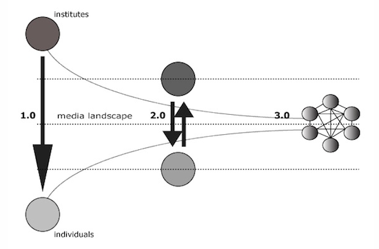 Digitale media hebben de laatste jaren gezorgd voor een enorme verschuiving in de manier waarop mensen informatie zoeken, nieuws ontvangen en met elkaar communiceren. Daar waar men in het verleden afhankelijk was van het informatie- en nieuwsaanbod via traditionele media (inclusief advertenties), zien we dat steeds meer mensen zelf informatie en nieuws met elkaar maken en delen via digitale media en dan de laatste jaren met name via sociale media op onze smartphone. Om deze verandering te schetsen, heb ik jaren gelden het zogenaamde convergentiemodel gemaakt (zie bovenstaand figuur). In dit model zien we de verschuiving van traditioneel zenden via vooraf gekozen doelgroepen en kanalen (1.0) naar een genetwerkte wereld waarin iedereen altijd en overal toegang heeft tot het netwerk (3.0).