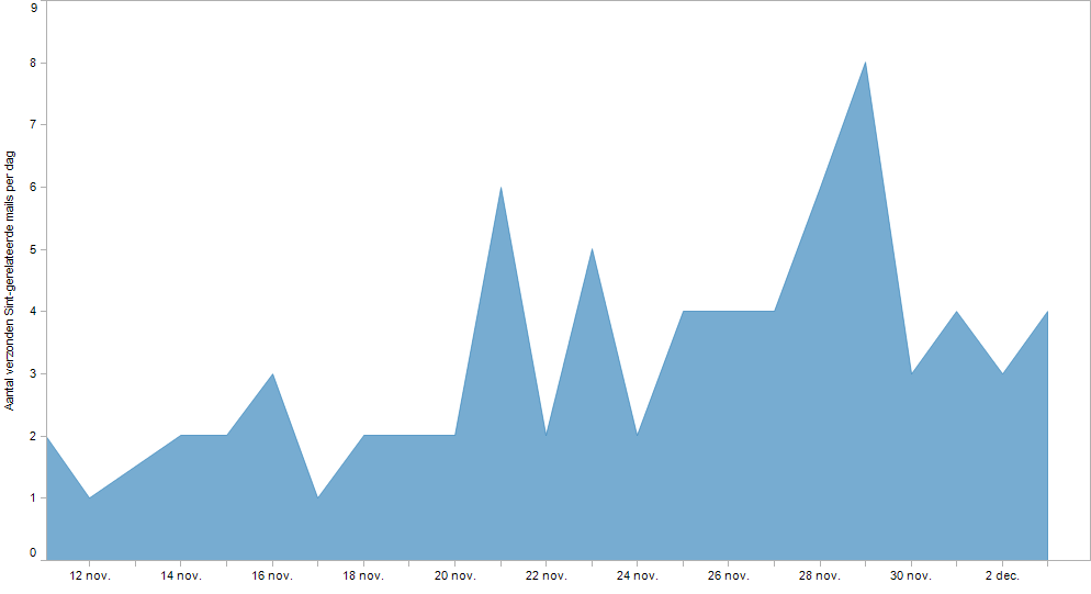 Hoe dichter het heerlijk avondje nadert des te meer er wordt verstuurd. Het absolute toppunt vindt plaats in de week van 25 november tot en met 1 december. In deze periode vonden er 29 verzendingen plaats. De meest drukke verzenddag was donderdag 29 november, 8 onderzochte retailers maakten in hun e-mailmarketing-uitingen een verwijzing naar Sinterklaas. Mogelijk ook omdat een groot aantal families al Sinterklaas op zondag 2 december vierden.