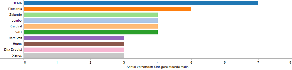 HEMA is de meest actieve retailer op het gebied van Sinterklaas en e-mailmarketing. In de onderzoeksperiode vonden maar liefst zeven verzendingen plaats met daarin een referentie naar de Sint. Ook Pixmania mengt zich nadrukkelijk in die strijd met 5 Sint-gerelateerde mails. Jumbo, Zalando, V&D en Kruidvat stuurden ieder 4 keer een nieuwsbrief met daarin Sinterklaas als thema.