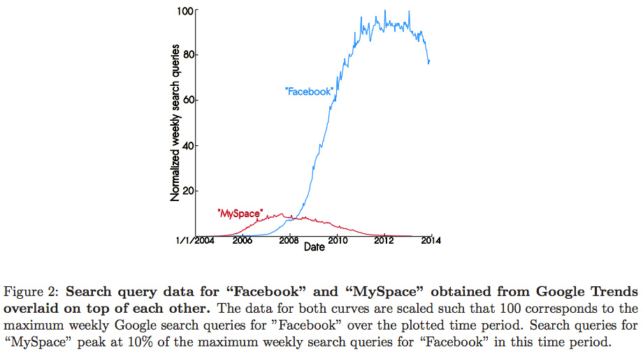 Voor dit onderzoek werd de Google Trends-service gebruikt om op te vragen hoe vaak gezocht werd op de term “Facebook” of op “MySpace”. Omdat het geval van MySpace ook in werkelijkheid een proces van opkomst en ondergang laat zien, passen deze data keurig in het model van Cannarella en Spechler. Dat laten ze zien door de gegevens in een grafiek te zetten, die inderdaad het model van besmetting lijkt te volgen.