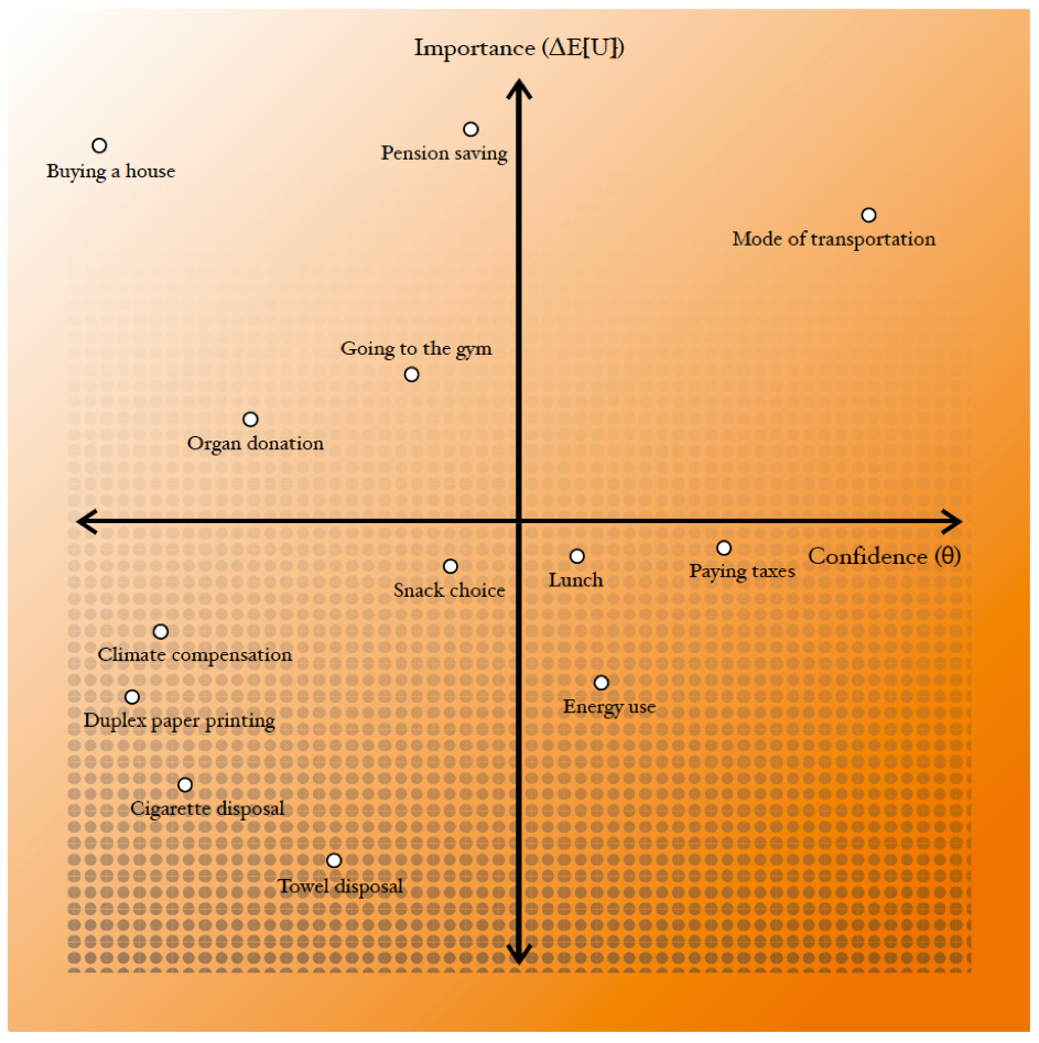 Bovenin het bovenstaande model staan keuzes die als belangrijk worden beschouwd, onderin staan keuzes die minder belangrijk zijn. Links staan keuzes waarbij een laag vertrouwen bestaat, rechts de keuzes met een hoog vertrouwen. Linksboven in het model is de kans dat de keuze bewust is het grootst. Deze neemt diagonaal af waarbij rechtsonder de kans het grootst is dat de keuze onbewust wordt gemaakt.
