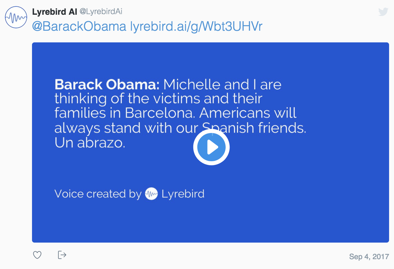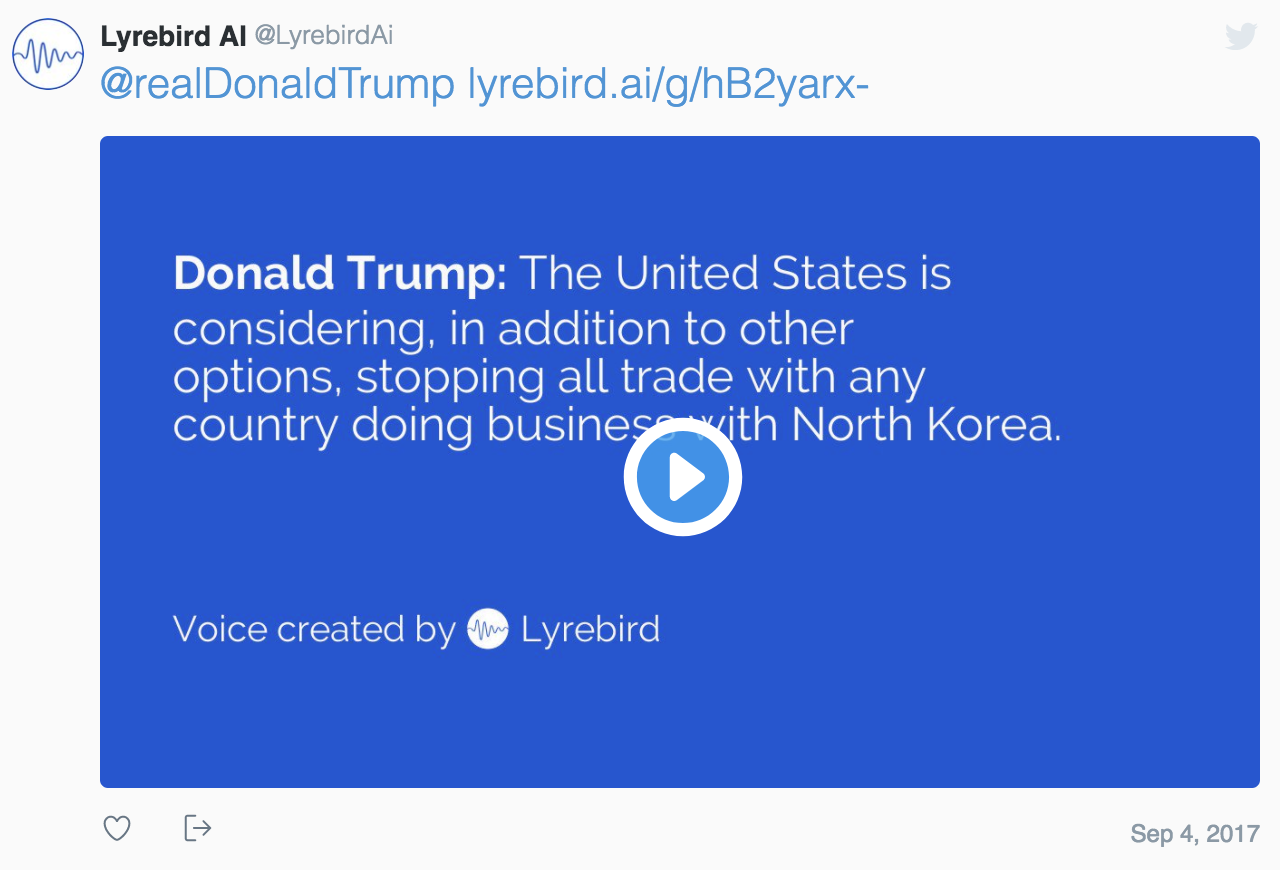Met de komst van de Algemene Verordening Gegevensbescherming (AVG) worden de termen data-privacy en data-ethics steeds vaker gebruikt. Heb jij als data-producent op dit moment nog wel iets te zeggen over jouw privacy? Hierbij denken we vaak aan ‘traditionele’ data, namelijk cijfertjes en getallen. Het recente AI-project van Lyrebird.ai (eerste publieke bèta) zette mij stevig aan het denken over data in de vorm van audio. Lyrebird maakt het mogelijk om binnen enkele minuten een stem te reproduceren op basis van 30 zinnen input. Hieronder het door AI gegenereerde voorbeeld van Donald Trump.