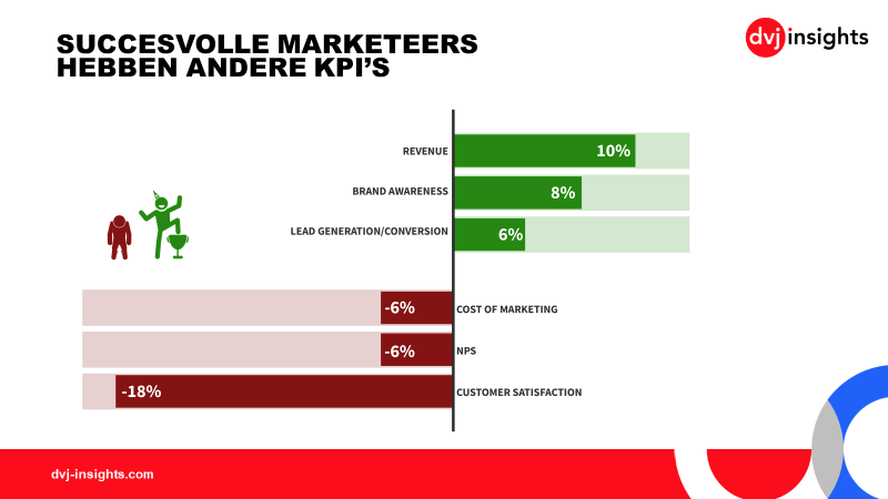 En wat leren we van marketeers zelf over het gebruik van NPS? In DVJ’s Brand Growth Study (een jaarlijkse studie onder ruim 500 marketeers in meerdere Europese landen) maken we een analyse naar winners en losers (marketeers werkzaam in groeiende of niet-groeiende organisaties). En wat blijkt? Winners sturen veel meer op business-gerelateerde KPI’s als omzet en conversie. Losers sturen met name op de kosten van marketing, klanttevredenheid en… NPS. Het helpt ze dus helaas niet om hun organisatie succesvoller te maken.