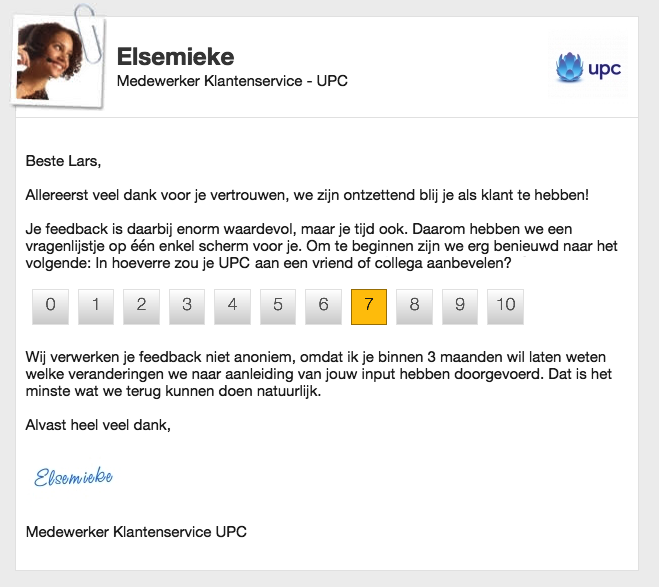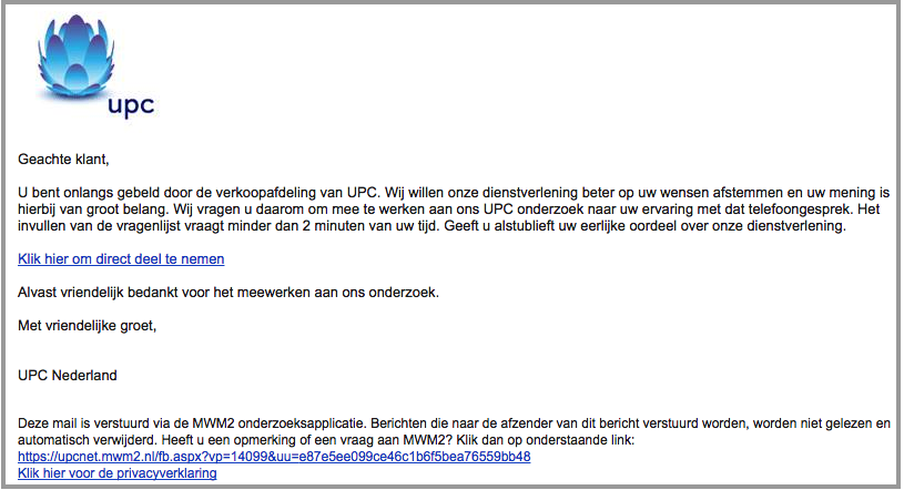 En nog belangrijker: wat ga je met de resultaten doen? Doe je het onderzoek ‘omdat het hoger management dat nou eenmaal jaarlijks wil’, of ben je bereid en in staat je werkzaamheden daadwerkelijk te verbeteren voor de klant? Oftewel: wat ga ik er als respondent van merken? Leg jezelf als organisatie daarom een bepaalde druk op en de responsrate zal exploderen. Laat ik ter illustratie twee voorbeelden geven, om te beginnen de volgende standaard uitnodiging van UPC: