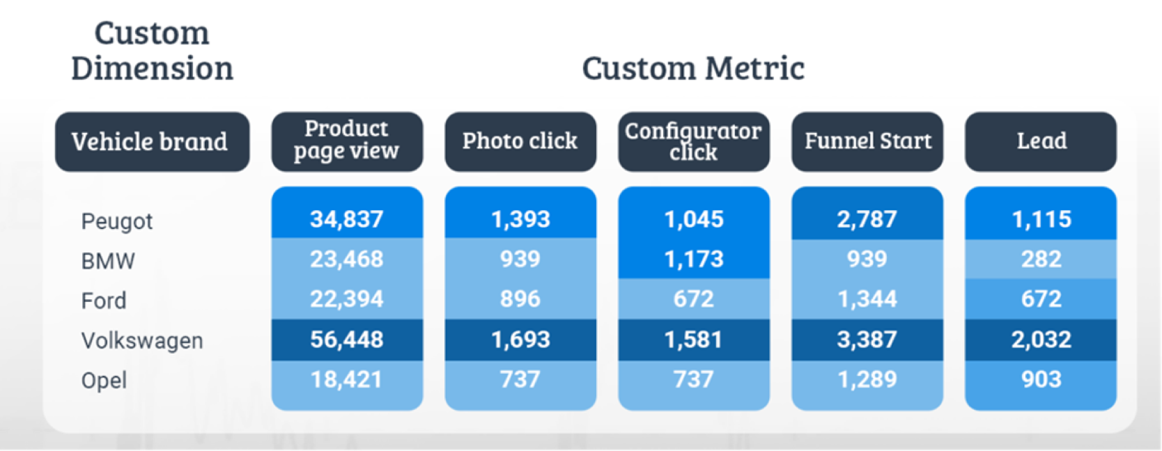 De eerste stap in het creëren van specifiekere en meer relevante data is het instellen van custom dimensions. Bij ons is deze setup verricht bij de overgang naar Universal Analytics. Met deze custom metrics kun je specifieke waarden per unieke gebruiker opslaan, zoals in ons geval bijvoorbeeld automerk, model en motorinhoud.