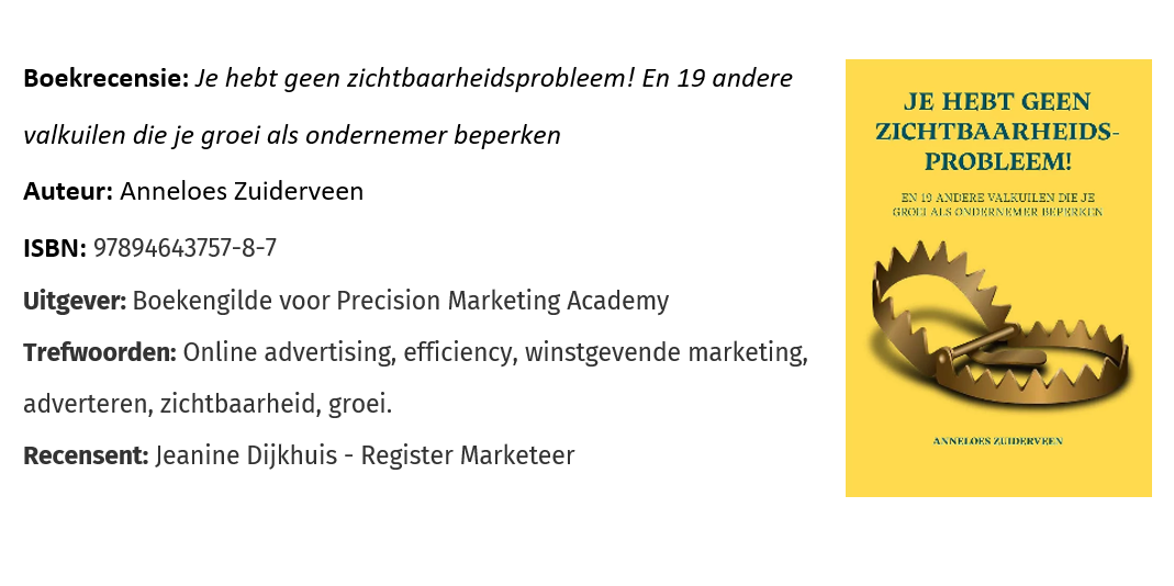 Het boekt vermeldt een aantal bonussen voor haar eigen academy en haar abonnementsmodel Precision Marketing Collectief. Al met al is dit een eenvoudig leesbaar boek met eye openers en waarheden voor ondernemers (meer dan voor marketeers) om zelf mee aan de slag te gaan. Als je geen zin hebt in lezen, is de podcast een goed alternatief. Want deze auteur is consistent in haar verhaal; of je het nou leest of luistert. Het boek biedt als voordeel dat je een naslagwerk hebt, dat je er met regelmaat even bij kunt pakken. Iets wat bij zelfhulp voor ondernemers ook wel prettig kan zijn.
