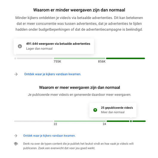 Het wordt makkelijker gemaakt om te achterhalen waarom een kanaal beter of slechter presteert. Met deze informatie is snel te zien wat al goed gaat en wat er misschien beter kan. Deze maand vanwege een campagne meer geüpload dan normaal? Probeer dit consistente uploadschema dan vol te houden, wanneer YouTube dat aangeeft als verklaring voor de betere prestaties op het kanaal.