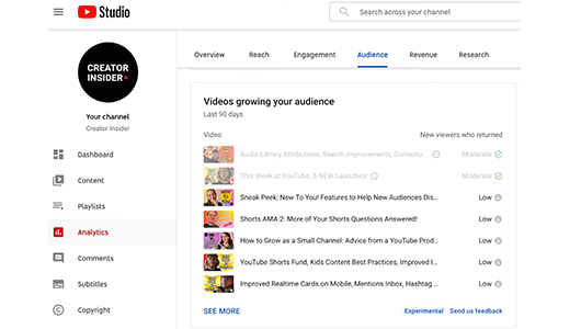 YouTube laat je weten welke video’s zorgen voor nieuwe kijkers. Nieuwe kijkers, die ook nog eens terugkomen op je kanaal. In deze nieuwe feature genaamd ‘videos growing your audience’ (lees: video’s die zorgen dat je meer publiek krijgt) zie je precies welke video’s daarvoor hebben gezorgd. Dit wordt beoordeeld van ‘Zeer hoog’, ‘Gemiddeld’ tot ‘Laag’.