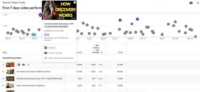 Meer weten over deze waardevolle nieuwe, terugkerende kijkers? Klik dan op ‘meer bekijken’. Je krijgt dan een uitgebreide spreidingsdiagram, die alle recent geüploade video’s en hun prestaties weergeeft. Gerankt op de hoeveelheid nieuwe, terugkerende kijkers. Dat zijn dus kijkers die nooit eerder een video van dit kanaal hebben bekeken en na het zien van die specifieke video terug zijn gekomen om er meer te bekijken.