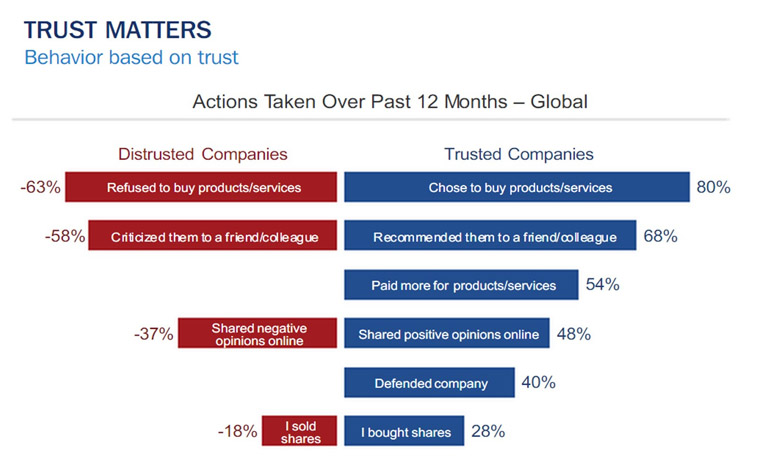 Vertrouwen kun je niet meteen in kliks en conversies vangen. Misschien is dat wel de reden dat we er als marketeers zo weinig oog voor hebben. Verblind door data, dashboards en kortetermijndoelen verliezen we uit het oog wat op langere termijn voor succes zorgt. Want uiteindelijk is het wel vertrouwen dat bepaalt of mensen zaken met jouw bedrijf gaan doen. Ook dat zie je terug in de eerder aangehaalde Edelman Trust Barometer.