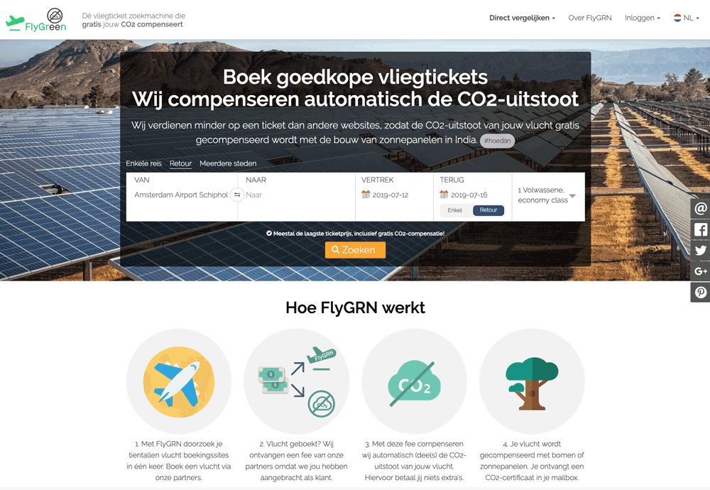 “Het beste voor het milieu is inderdaad om het vliegtuig links te laten liggen en te kiezen voor ander vervoer. Door CO2 te compenseren zorg je er natuurlijk ook niet voor dat de daadwerkelijke uitstoot van je vlucht vermindert: die vlucht zelf is nog steeds heel vervuilend. Maar met het oog op de groei van de luchtvaartbranche is het helaas niet zo realistisch om te denken dat iedereen per direct zal stoppen met vliegen. Daarom richten we ons bij FlyGRN ook op het creëren van bewustzijn over de impact die het maken van een reis heeft. Dit doen we door bezoekers al tijdens het boekingsproces te informeren over de CO2-uitstoot van een reis. Aan de hand van kleine infographics geven we aan hoeveel CO2-uitstoot de vlucht zal veroorzaken en aan hoeveel wasjes of douchebeurten die uitstoot gelijkstaat.”
