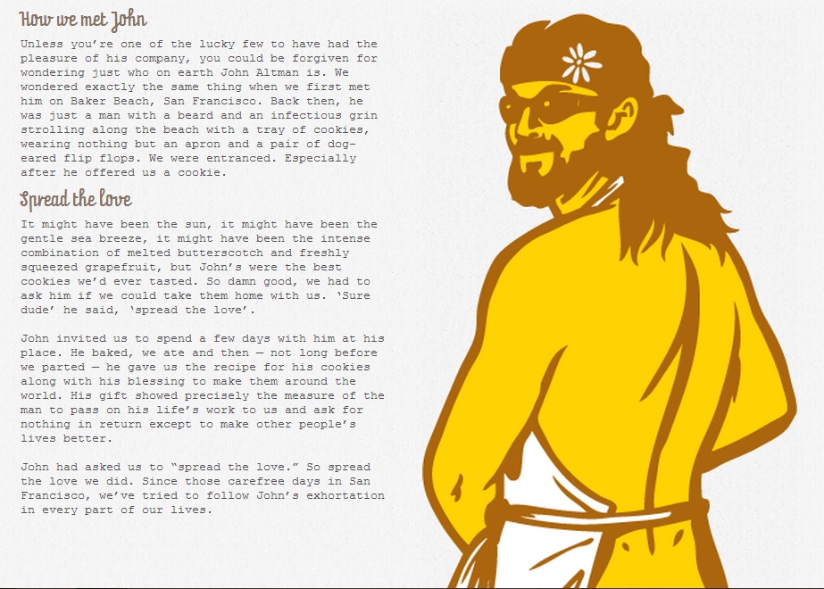 Die wens was er al langer, maar kwam in een stroomversnelling toen ze in San Francisco een oude hippie ontmoetten die koekjes uitdeelde op Baker Beach. Onno: “Die man raakte ons en zette ons aan het denken over de manier waarop we ons eigen leven invulden. En de koekjes die hij uitdeelde, waren zo lekker dat we het recept vroegen en mee terugnamen naar Nederland.” Spread the love drukte hij Onno en Hajo op het hart en dat is wat ze met John Altman doen. En de bijzonder ontmoeting? Die vormt de kern van het verhaal achter het merk.